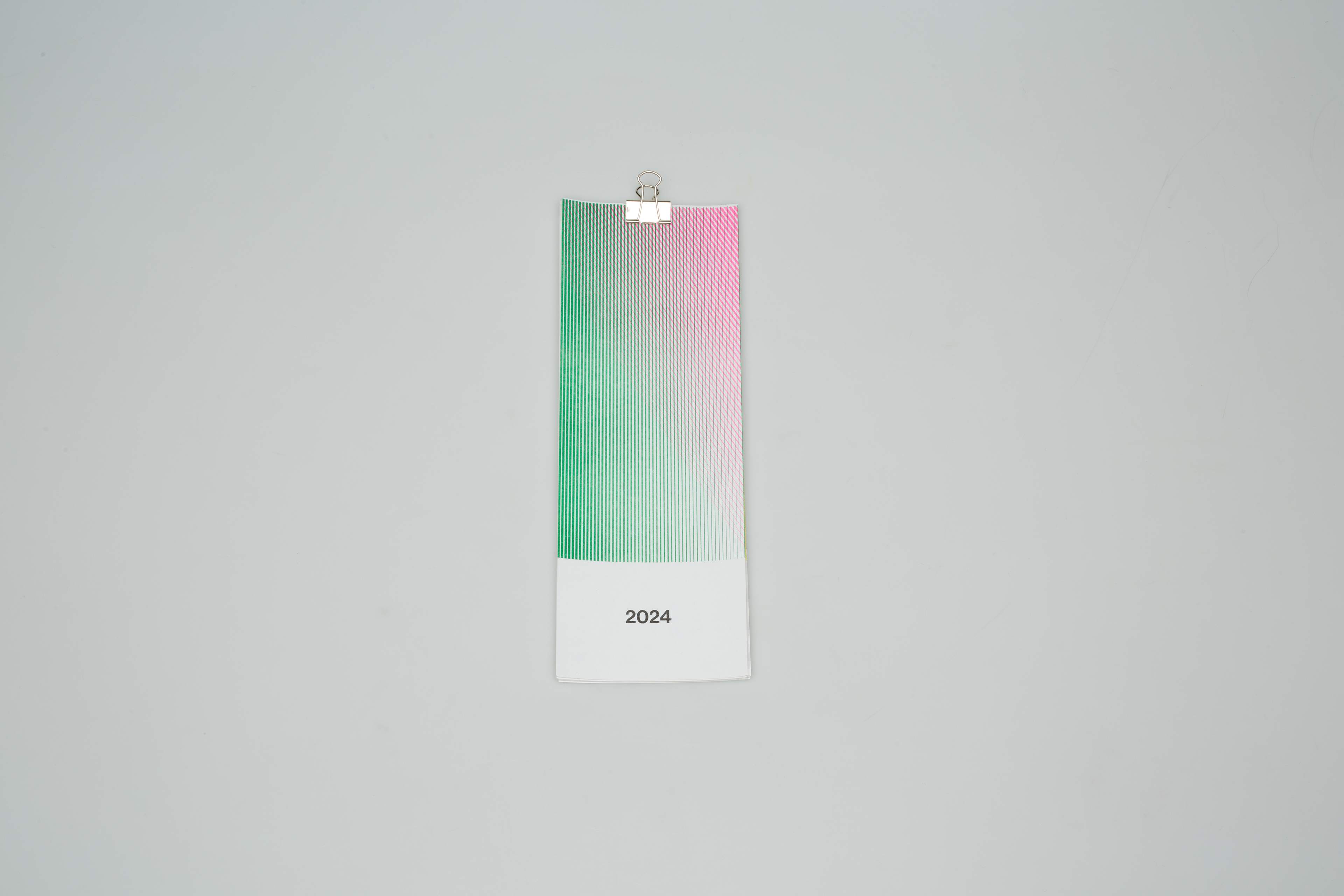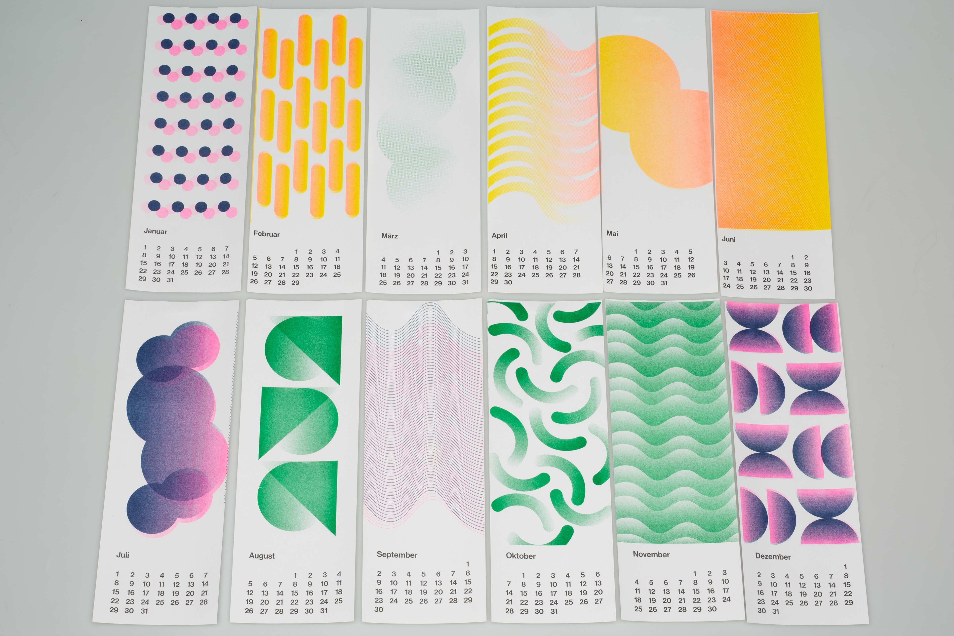 Für den Kalender 2024 wurde ein Design im Format DIN lang entwickelt, das mit Formen und Verläufen spielt. Der Kalender wurde am Risograph am Fachbereich Gestaltung Darmstadt gedruckt. Es wurden insgesamt 5 Farben (Blue, Green, Fluo Pink, Fluo Orange und Yellow) in drei verschiedenen Kombinationen verwendet. Die komplette Umsetzung und Produktion erfolgten zusammen mit Carla Volk.