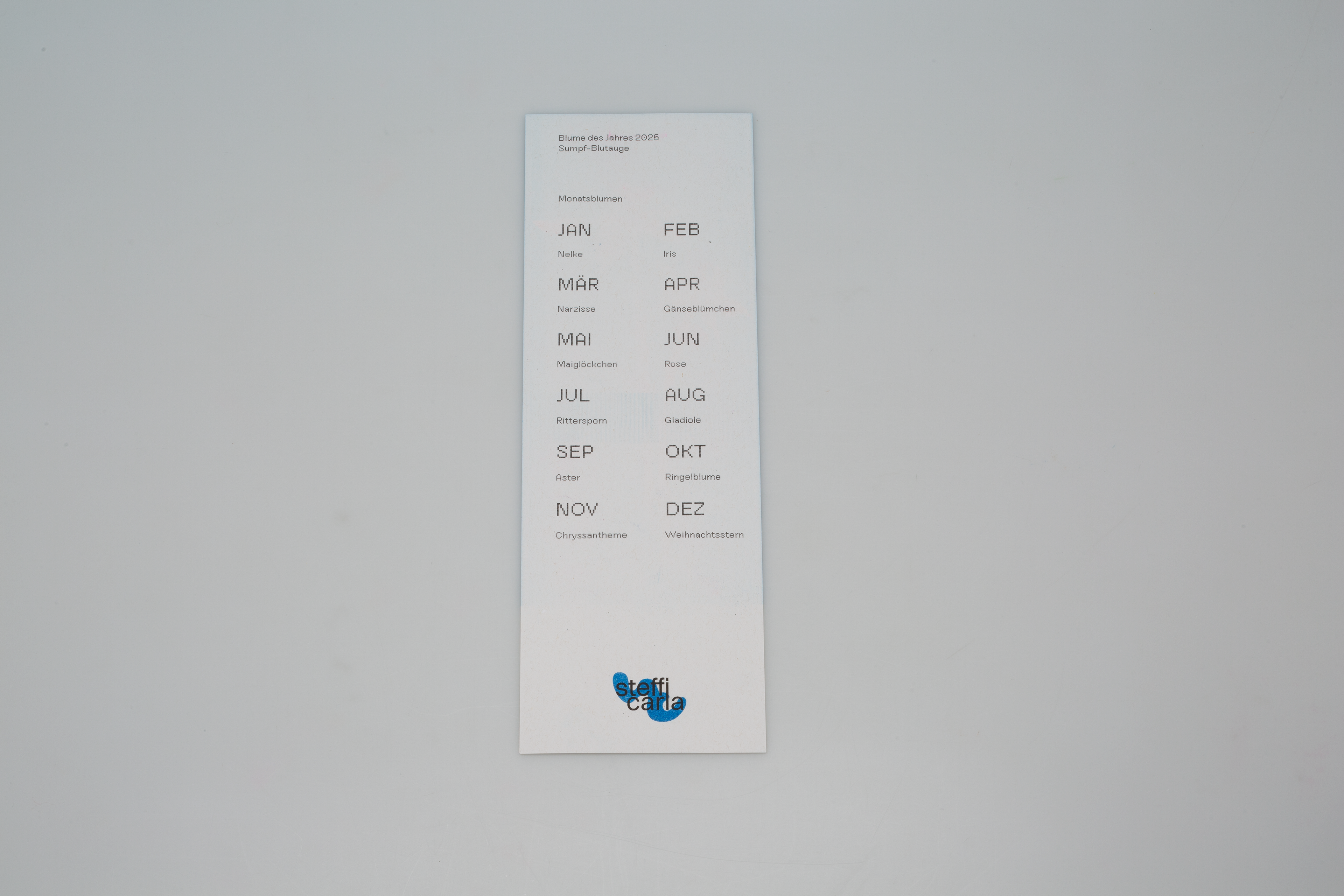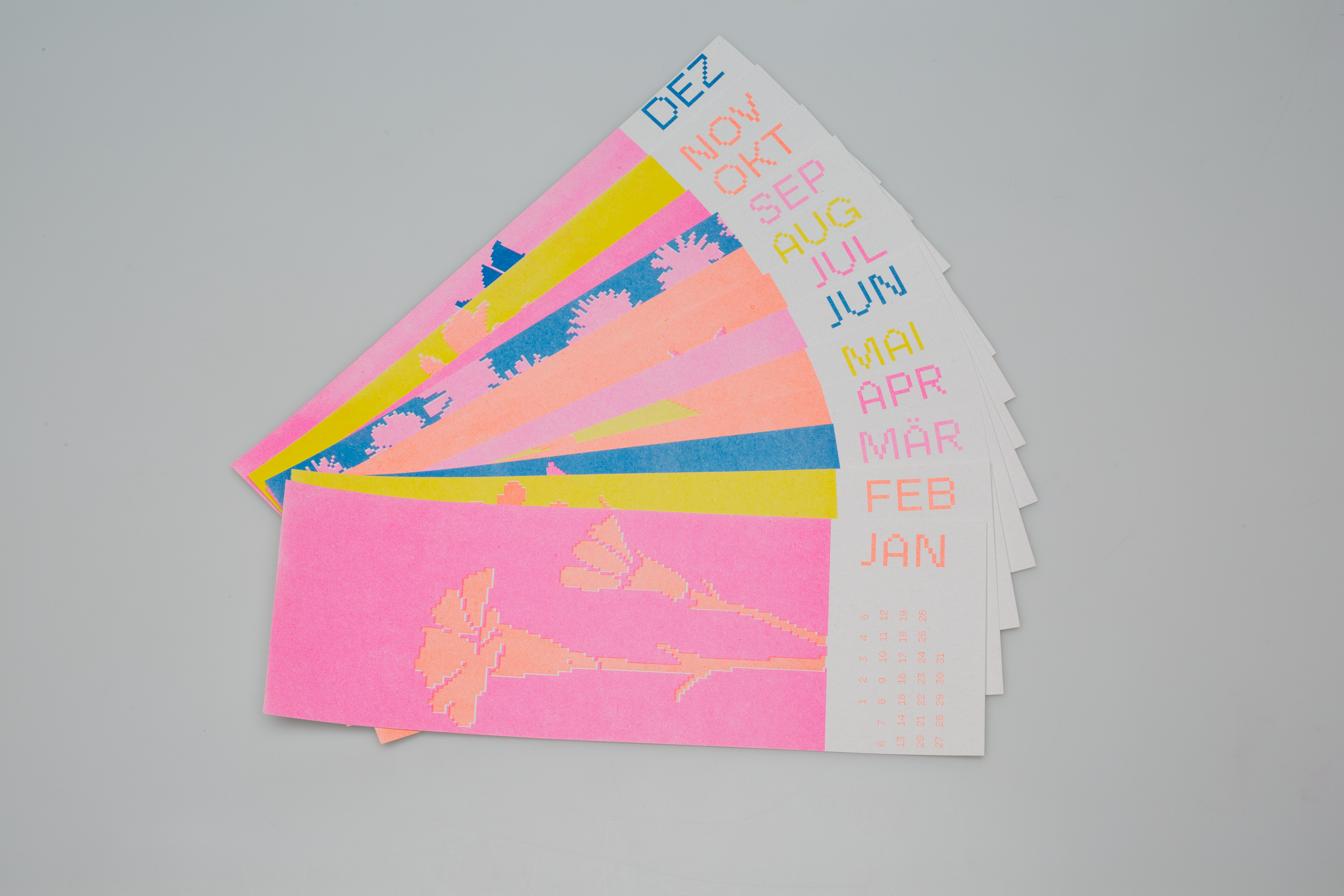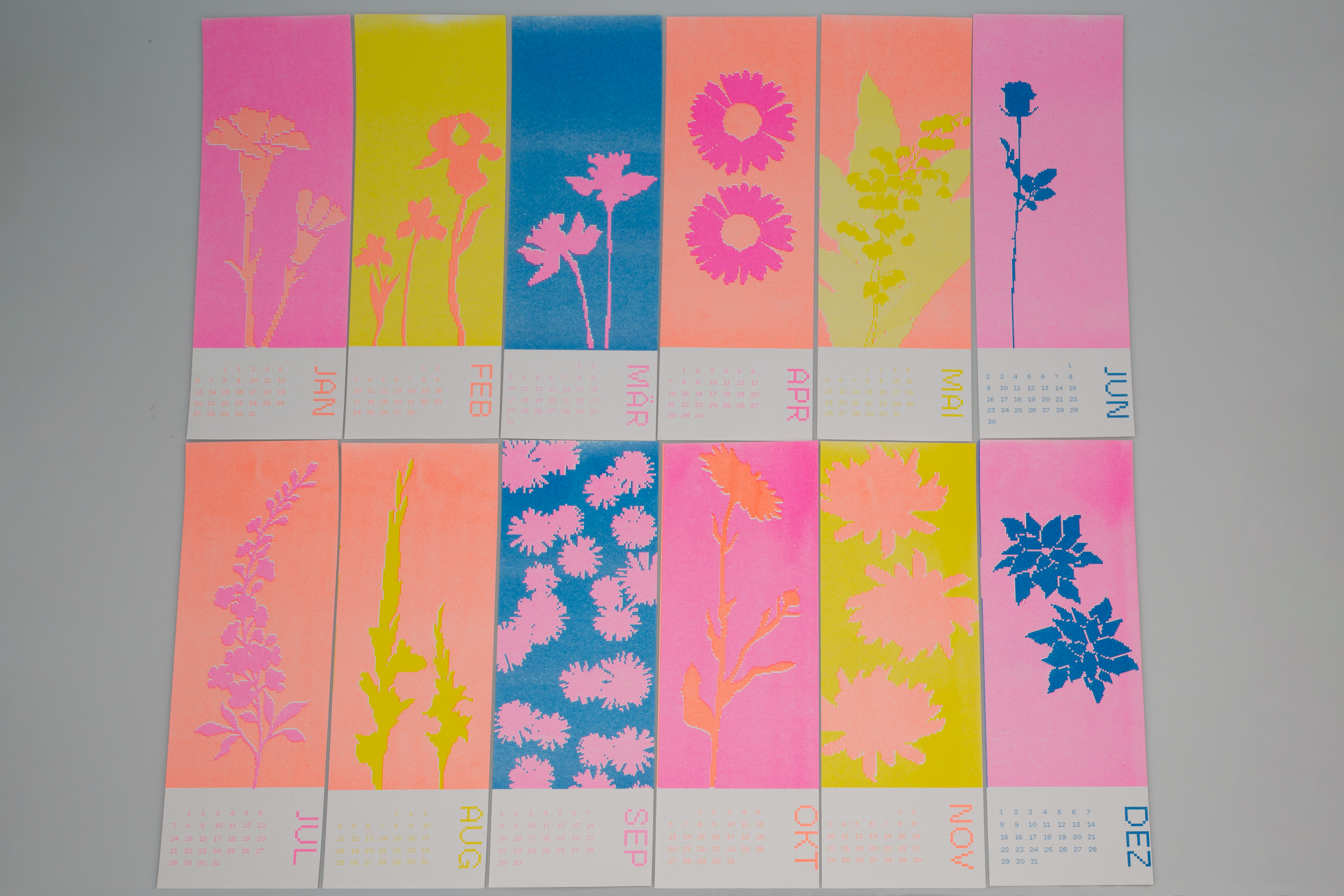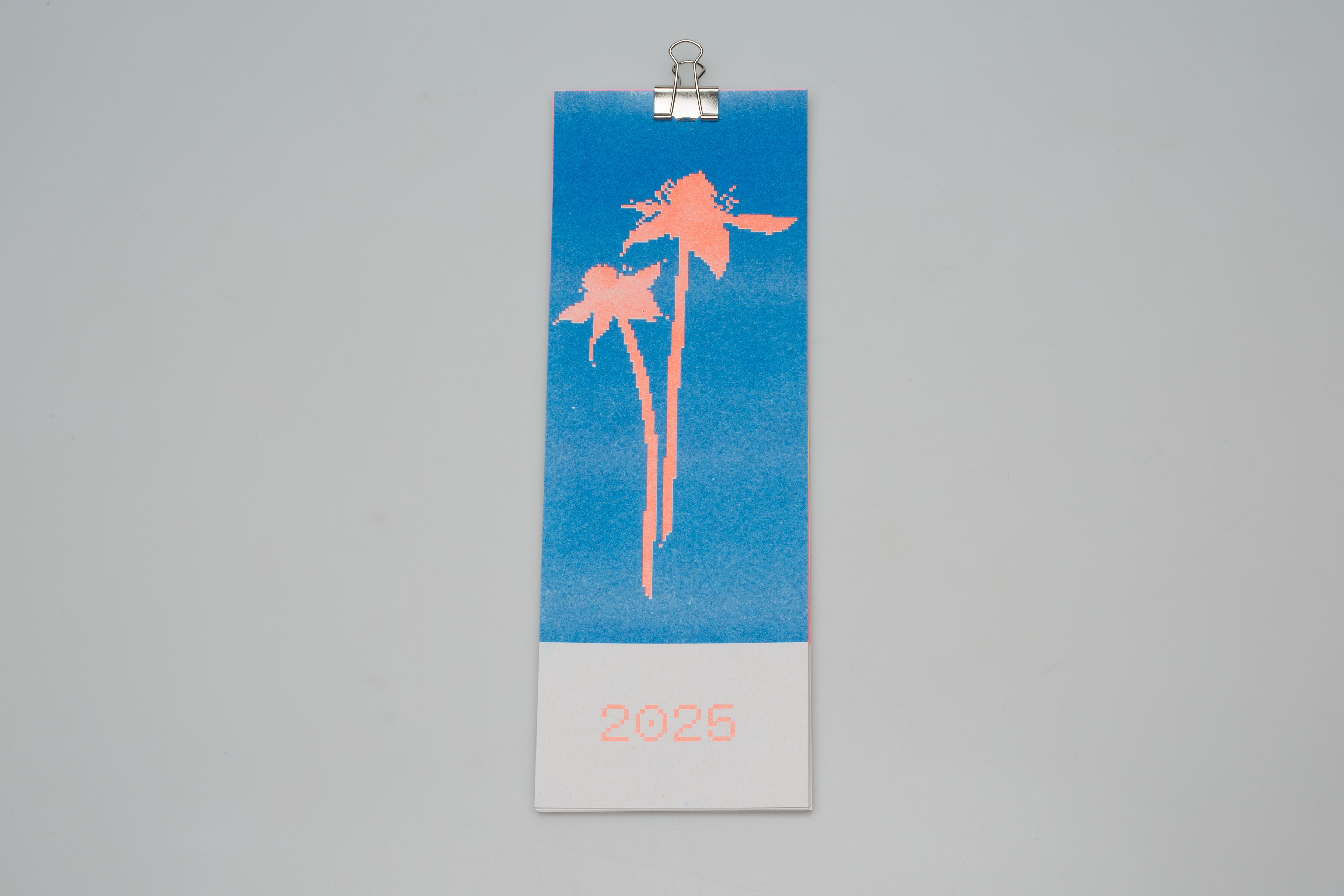 Für den Kalender 2025 wurde ein Design im Format DIN lang entwickelt, das mit Monatsblumen spielt. Das Cover zeigt dabei die Blume des Jahres 2025, das Sumpf-Blutauge. Der Kalender wurde am Risograph am Fachbereich Gestaltung Darmstadt gedruckt. Es wurden insgesamt 4 Farben (Blue, Fluo Pink, Fluo Orange und Yellow) in drei verschiedenen Kombinationen verwendet. Die komplette Umsetzung und Produktion erfolgten zusammen mit Carla Volk.