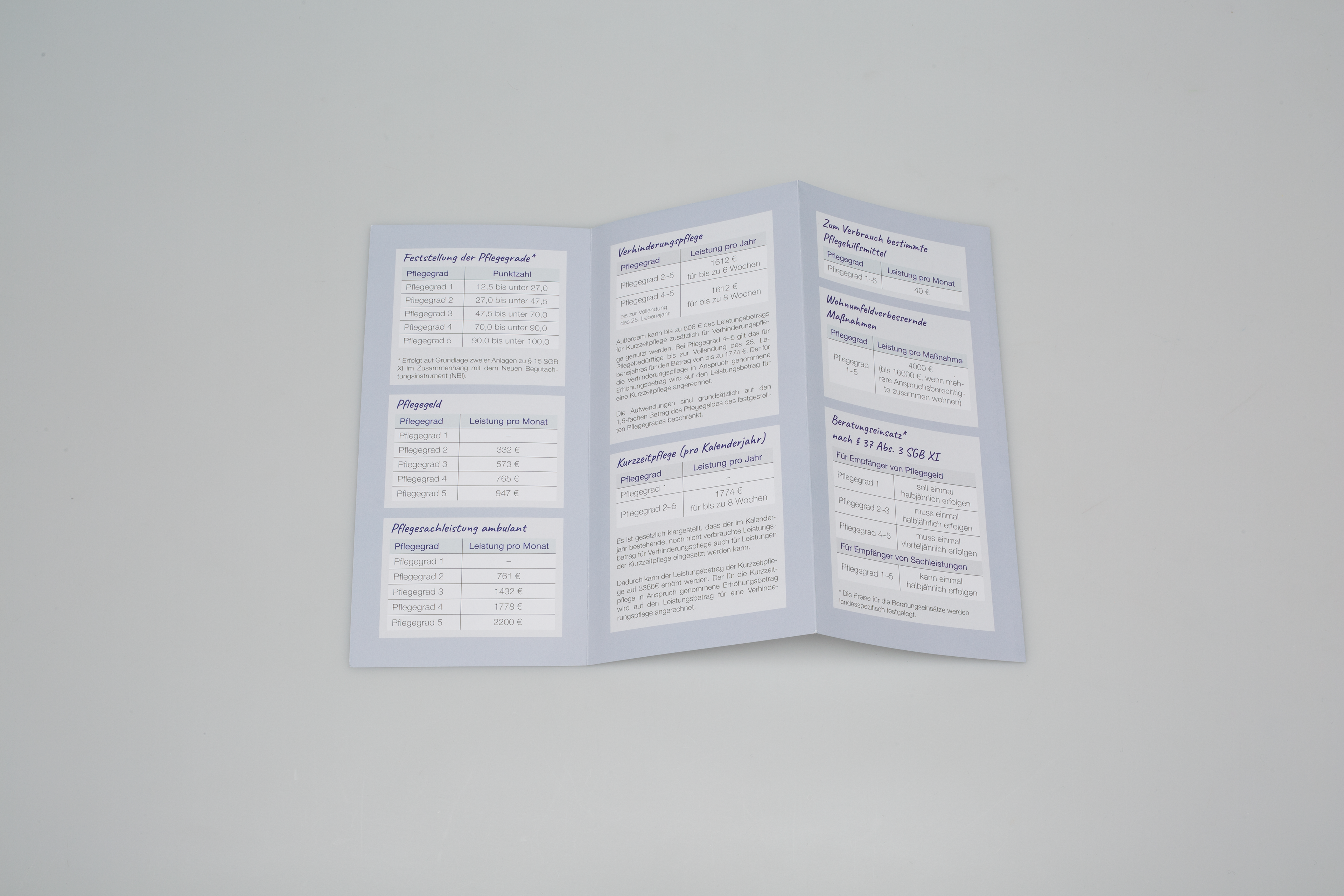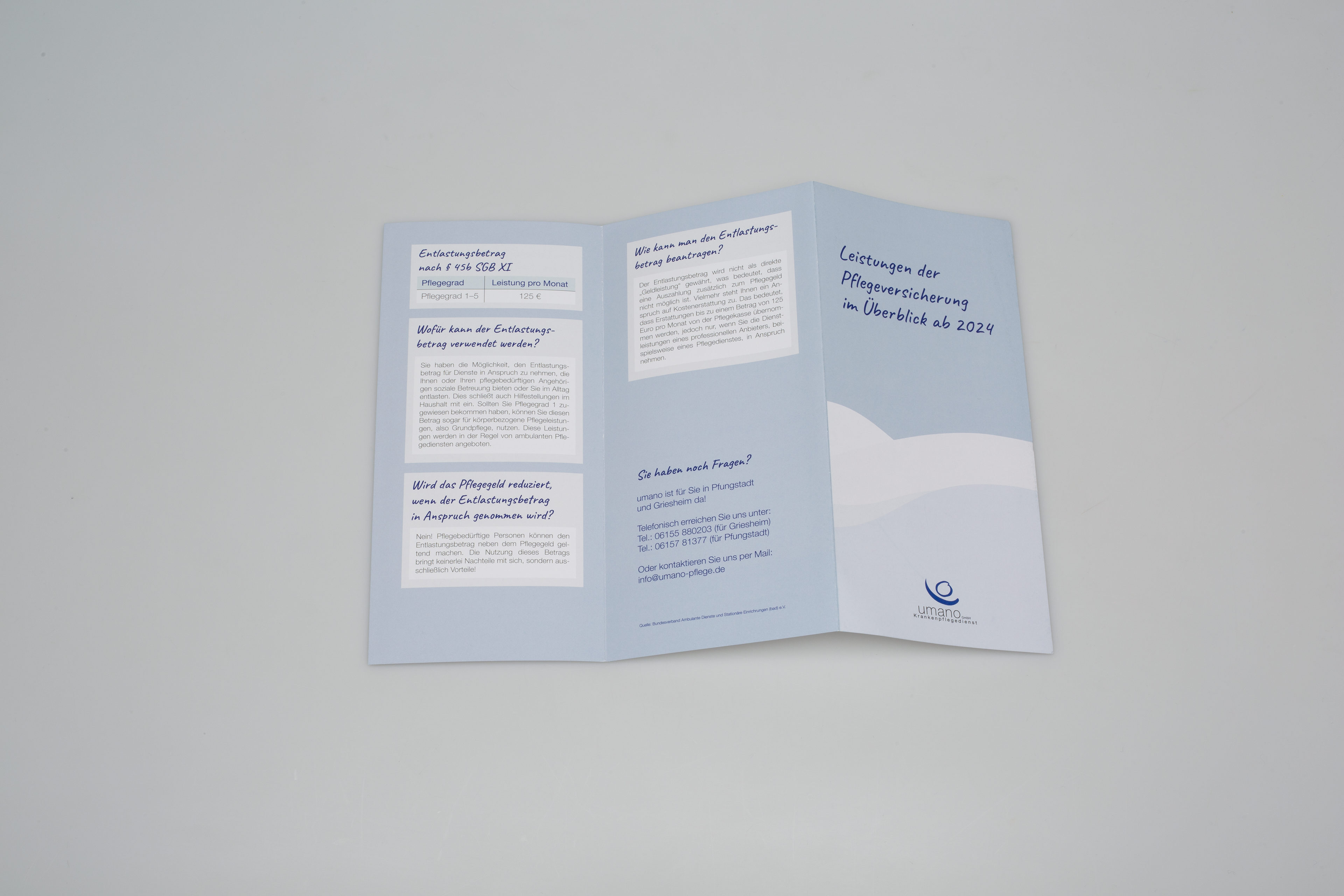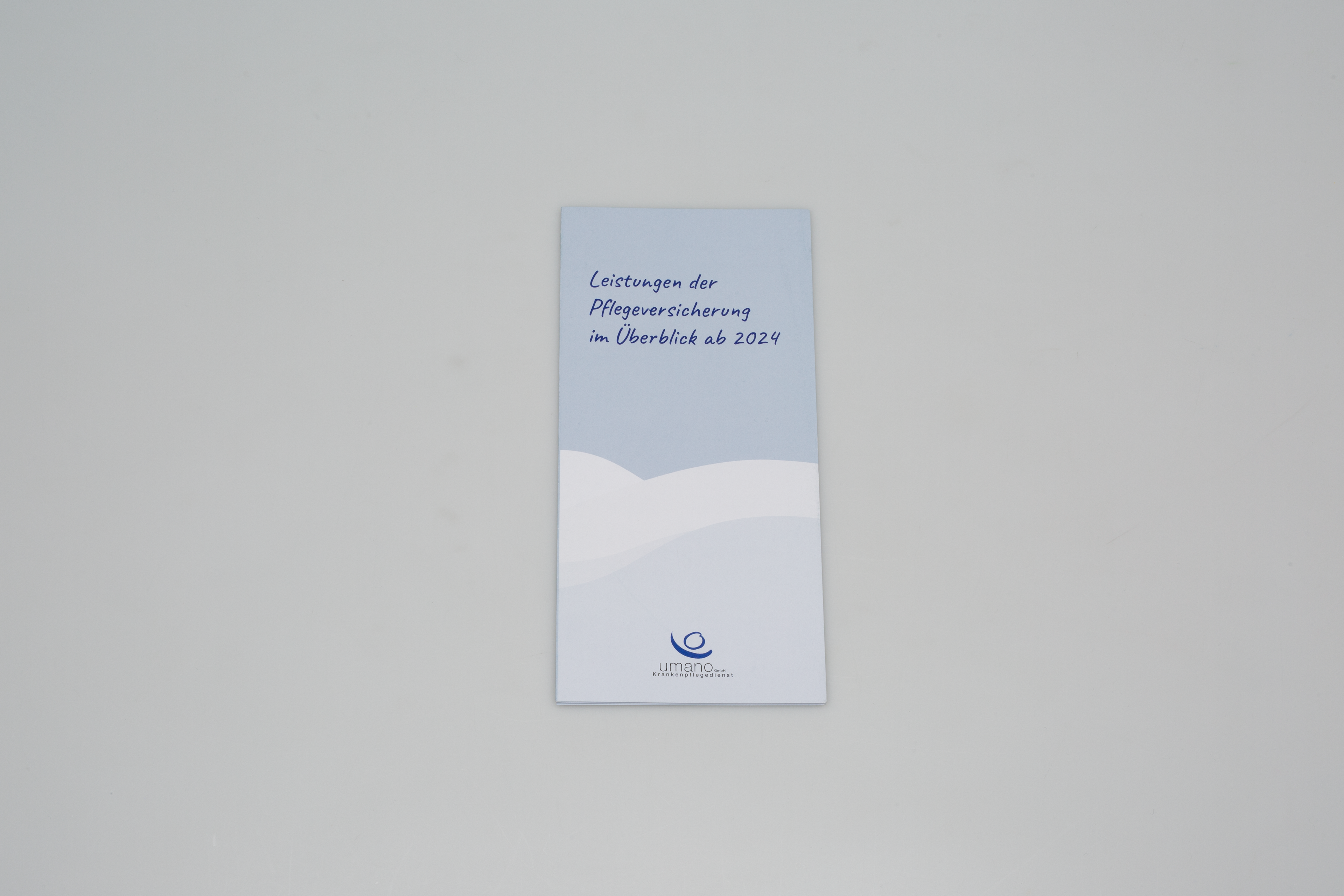 Für die umano GmbH wurde ein Faltblatt im Format DIN lang gestaltet, das einen übersichtlichen Überblick über die Leistungen der Pflegeversicherung für 2024 bietet. Das Design orientiert sich an der Corporate Identity von umano und wurde auf 170 g Bilderdruckpapier matt gedruckt.