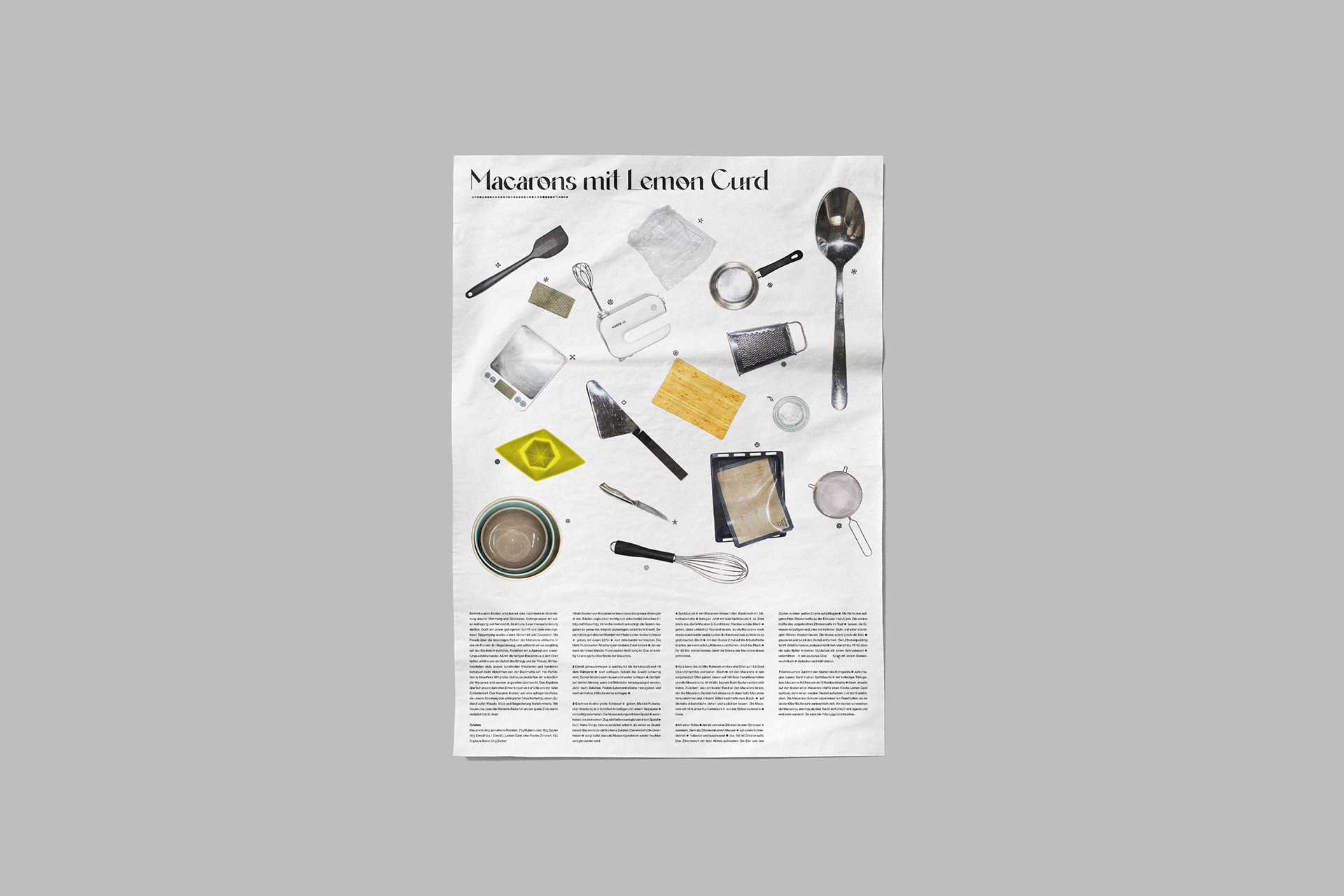 In einem einwöchigen Blockkurs wurde ein Rezept für Macarons mit Lemon Curd basierend auf den vorgegebenen Wörtern Zitrone, Gramm und manieriert entwickelt. Auf dem Plakat sind die benötigten Utensilien abgebildet, jedes mit einem kleinen Symbol, das im Text erscheint, wenn das jeweilige Utensil in den Zubereitungsschritten gebraucht wird. So wird der Rezeptprozess in einer übersichtlichen Infografik dargestellt. Das Plakat wurde im Format DIN A1 auf nachhaltigem 140g Bilderdruckpapier matt bei SE Druck Darmstadt gedruckt.
